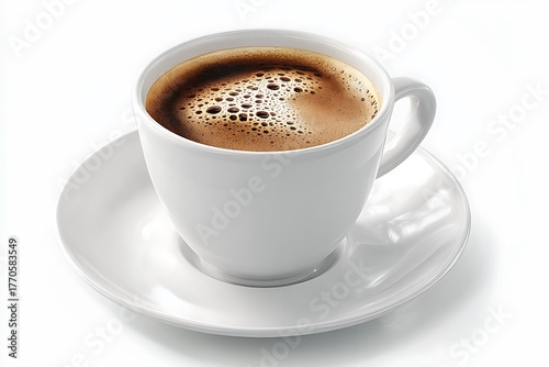 Elegant White Ceramic Coffee Cup with Fresh Espresso and Crema on Minimalist Saucer for Lifestyle and Beverage Branding