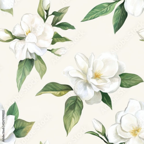 Elegant White Flowers with Green Leaves Seamless Botanical Pattern Springtime Floral Beauty Backdrop