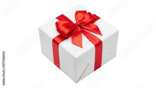 Elegant white gift box wrapped with a vibrant red satin ribbon and bow isolated on white
