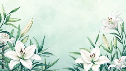Elegant white lilies with green leaves on soft light background for artistic and nature inspired designs