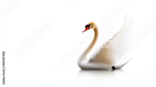 Elegant white swan gracefully floating on calm water with wings spread against a bright white background. Perfect image for nature and wildlife themes.
