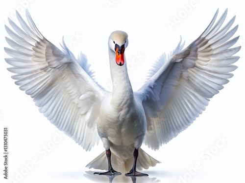 Elegant White Swan Spreading Wings, Graceful Pose, Isolated on White Background