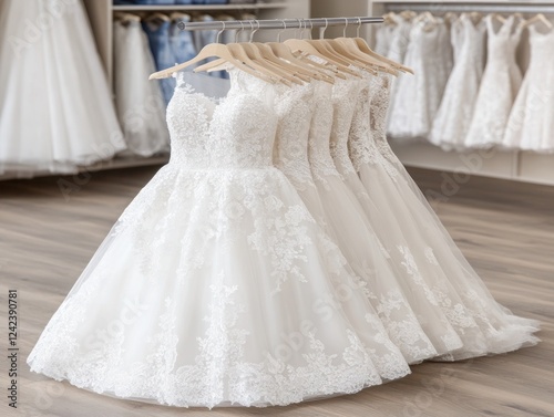 Elegant White Wedding Dresses on Hangers in a Bridal Boutique Displaying Sophisticated Lace and Tulle Designs for Modern Brides