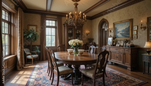 dining room, interior design, chandelier, floral arrangement, natural light, home interior, warm tones, craftsmanship, artwork, table setting, fine dining