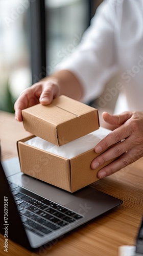 Elegant workspace showcases a person organizing stylish storage boxes and stationery on a wooden table surrounded by plants in a modern setting