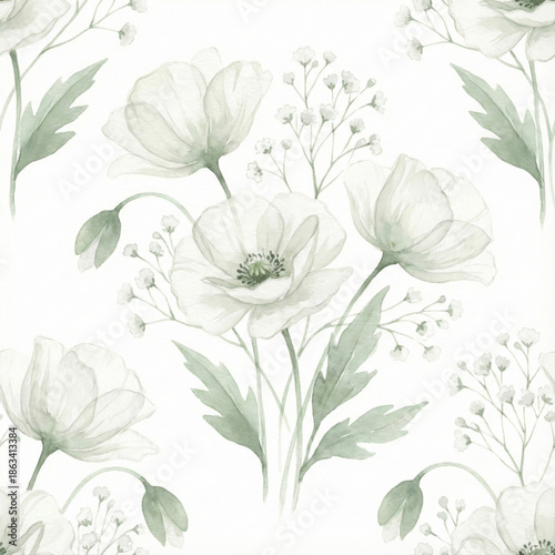 elicate White Poppy Watercolor Seamless Pattern for Wedding Decor