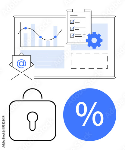 Email icon, clipboard, gear, data graph, security lock, and percentage symbol. Ideal for data analysis, security, email communication organizational processes efficiency workflow management