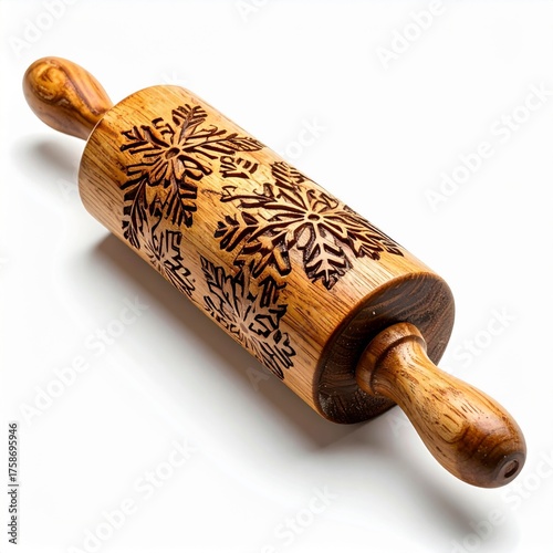 rolling, pin, wood, wooden, snowflake, pattern, christmas, winter, baking, cookie, dough, kitchen, utensil, carved, rustic, craft, hand-made, texture, design, culinary, domestic, food, holiday, closeup, detailed, tableware, equipment, tool, preparation, ingredient, background, object, cooking, pastry, sweet, symbol, symbolic, flat, lay