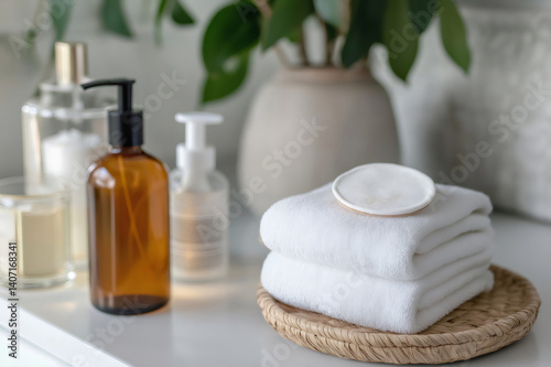 Embracing eco consciousness, reusable cosmetic pads lie on soft towels, showcasing a sustainable approach to beauty care alongside natural bath products