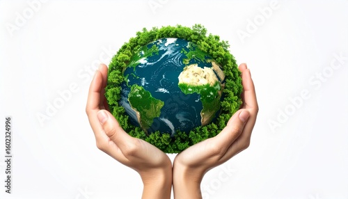 Embracing the Earth: A tender pair of hands cradles the Earth, adorned with lush greenery, highlighting a dedication to environment