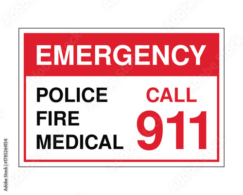 Emergency Contact Sign with 911 Number for Police, Fire, and Medical Services, Safety Instruction Poster, Red and White Warning Sign for Public Safety Awareness and Emergency Preparedness Stock Photo