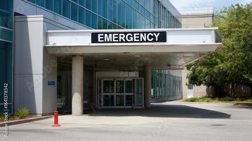 Emergency entrance of modern hospital featuring large sign. structure showcases sleek design with glass panels and covered canopy, providing welcoming yet urgent atmosphere