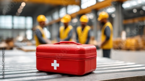 Emergency Preparedness in Industrial Factory Environment with Red First Aid Kit and Workers Present