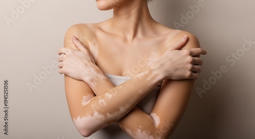 Emotional portrait of woman with vitiligo embracing her body. Concept of self-acceptance, skin health, and beauty standards. Soft lighting highlighting skin pigmentation patterns.