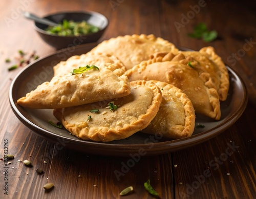 Empanadas arranged on brown plate with herbs and dipping sauce on wooden table