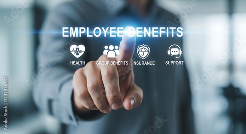 Employee benefits concept a finger touches a digital screen displaying icons for health, retirement, insurance, and career support, highlighting company perks