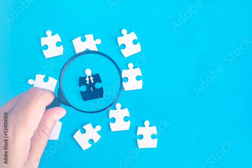 Employee recruitment concept, Blocks, puzzles and magnifying glass represent the concept of recruiting personnel to participate in the event.