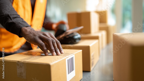 logistic, shipping, warehouse, men at work, employee, scanning, barcode, package, parcel, box, delivery, distribution, e-business, fulfillment, industry, inventory, management, cardbox, retail, export, import, global, transportation, commercial, business, process, order, hand, label, working, african american, african, person, male, adult, uniform, manual, closeup, technology, digital, operation, factory, service, economy