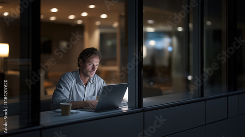 night, office, alone, laptop, sleepy, employee, stress, hot drink, screen, overwork, burnout, corporate, pressure, realistic, light, deadline, silence, fatigue