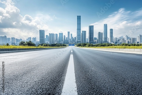 road, city, skyline, urban, modern, empty, street, skyscraper, architecture, building, downtown, future, progress, transportation, infrastructure, development, travel, perspective, business, clean, blue skies, morning, bright, city landscape, planning, direction, tower block, view, asphalt, industry, opportunity, growth, horizon, business building, success, path, metropolitan, innovation, journey, structure, vision, highway, real estate, sunrise, clarity, freedom