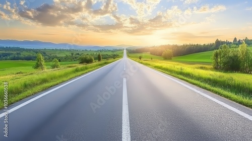 Empty Asphalt Road Through Green Fields at Sunset, Scenic View, Success, and Inspiration.