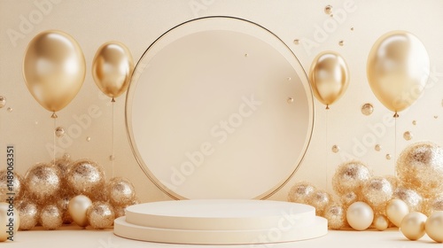 Empty beige podium surrounded by golden balloons and a circle.