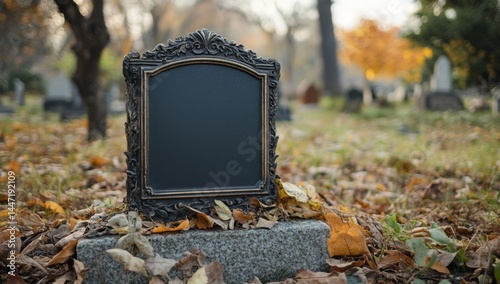 Empty black gravestone framed mockup by autumn leaves in a quiet cemetery