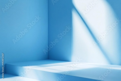 Empty Blue Corner Stage with Sunlight and Shadows: Ideal Background for Product Display