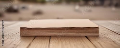 Empty booklet mockup, wooden surface, soft-focus outdoor scene , natural, pamphlet