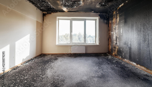 Empty burned room with window. Damaged apartment after house fire, charred walls and ceiling.