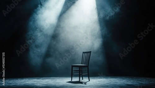 chair, empty, spotlight, smoky, dark, room, stage, theatre, illuminated, scene, waiting, performance, audience, alone, solitude, expectation, mystery, drama, black, grey, concrete, floor, stillness, darkness, fog, haze, evacuated, light, beam, illumination, single, object, still, photorealistic, studio, interior, dramatic, silhouette, empty space, anticipation, tension
