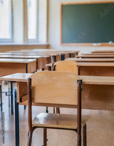 Empty Classroom. Vintage wooden Chairs and Desks, Back to school concept