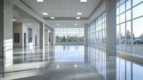 empty, dealership, minimalist, design, roomy, open, layout, neutral, tone, sleek, decor, modern, showroom, marketing, feature, large, window