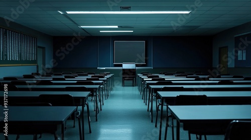 Empty desk with a closed laptop, bright light, clean classroom
