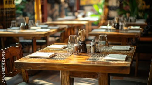 Empty dining tables with traditional settings in a South Asian restaurant, with ample space for copy