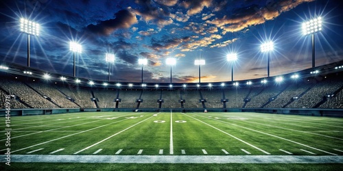 Empty football field illuminated by stadium lights at night , sports, soccer, stadium, bright, goalposts, outdoor
