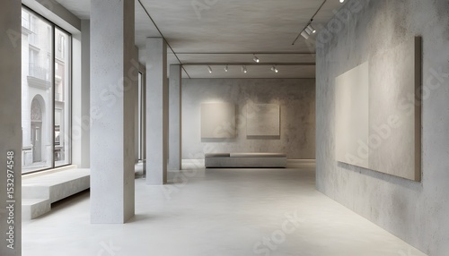 interior, roomy, daylight, exhibition, grey, showcase, space, contemporary, white, display, exhibit, art, clean, empty, elegant, neutral, window, modern, bright, column, smooth, wall, painting, beige, gallery, floor, concrete, light, minimalist, simple, architecture, design