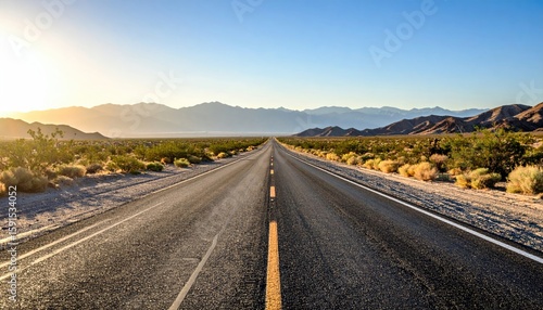 highway, road, desert, sunrise, mountain, empty, vista, landscape, travel, journey, adventure, open, horizon, sunlight, nature, scenic, wide, endless, calm, quiet, peaceful, drive, beauty, freedom, morning, gold, faraway