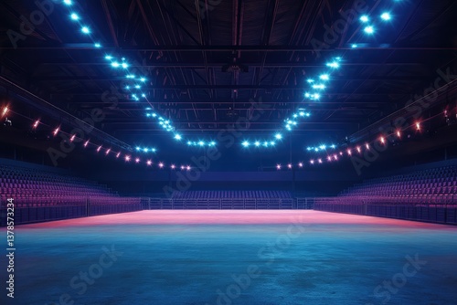 Empty illuminated arena with high ceiling and rows of seats. AI generated illustration.