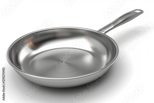 Empty inox frypan for frying, searing, and browning food. Metallic frying pan having handle Isolated on white background.