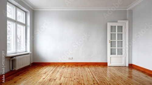 Empty interior room displays light gray walls, polished wood floor, and white framed window beside a paneled doorway