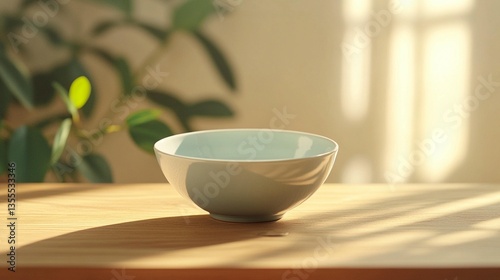 bowl, ceramic, empty, light, blue, table, wood, sun, shadow, home, interior, kitchen, dining, food, drink, tea, hot drink, breakfast, dessert, minimal, simple, clean, elegant, style, design, modern, rustic, calm, peaceful, serene, bright, morning, day, space, texture, surface, background, object, scene, image, photo, still, life