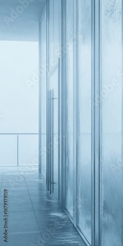 corridor, modern, empty, glasses, wall, interior, architecture, light, blue, tone, empty space, hallway, passage, urban, contemporary, structure, design, perspective, building, elevated, long, smooth, clean, minimalist, geometric, roomy, industrial, modernist