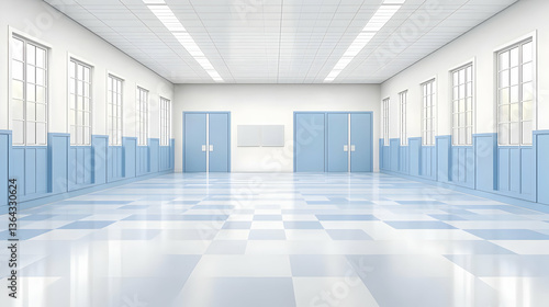 corridor, hallway, empty, modern, interior, building, architecture, hospital, school, light, blue, white, clean, empty space, room, window, door, tile, light blue, modern architecture, contemporary, design, perspective, wide, long, medicals, office, bright, neutral, sterile, lighting