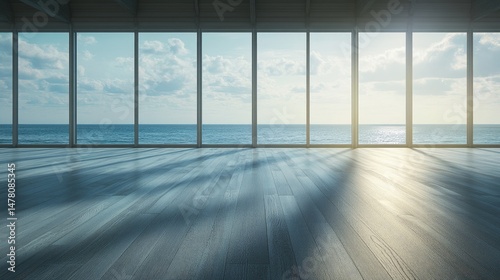 empty, modern, interior, ocean, view, window, light, sun, sky, cloud, horizon, floor, wood, shadow, daylight, room, space, large, glasses, architecture, design, building, perspective, wide, exterior, viewpoint, sunlight, sea, blue, water, illumination, open, contemporary, bright, natural