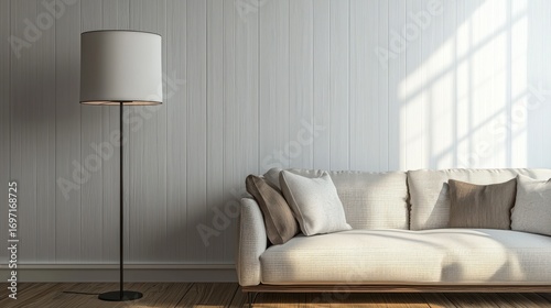 interior, living, room, wall, beige, light, floor, sofa, couch, lamp, white, pillow, home, decor, design, furniture, modern, empty, shadow, sunlight, natural, lighting, wooden, clean, simple, contemporary, comfortable, house, architecture, bright, space, isolated, digital, illustration, rendering