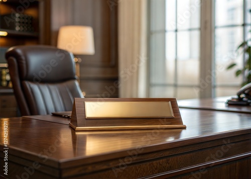 Empty Nameplate on a Luxurious Wooden Desk in a Prestigious Office