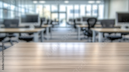 Empty office desk with vacant chairs and computers, symbolizing workforce layoffs and corporate downsizing, representing unemployment and economic challenges in modern workplace.