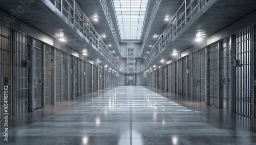 gaol, hallway, interior, concrete, metal, cell, light, empty, corridor, long, perspective, modern, architecture, geometric, empty space, security, steel, grey, white, grey, light grey, industrial, large, structure, bright, sun, glasses, skylight, reflecting, clean, door, window, wall, system, future, urban, space, huge, longitudinal, design