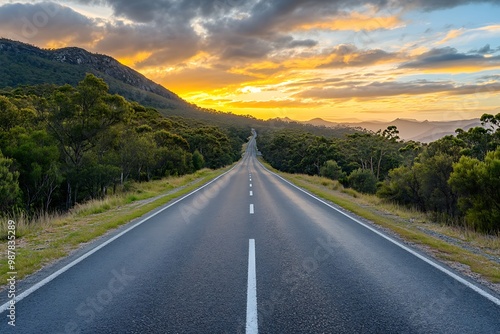 road, highway, empty, sunset, mountain, landscape, nature, travel, scenic, adventure, journey, destination, freedom, sky, cloud, horizon, gold, light, dusk, evening, rural, asphalt, perspective, long, straight, drive, wanderlust, explore, scenic route, countryside, wilderness, peaceful, calmness, relaxing, inspiring, hope, future, optimism, automobile, vehicle, transportation